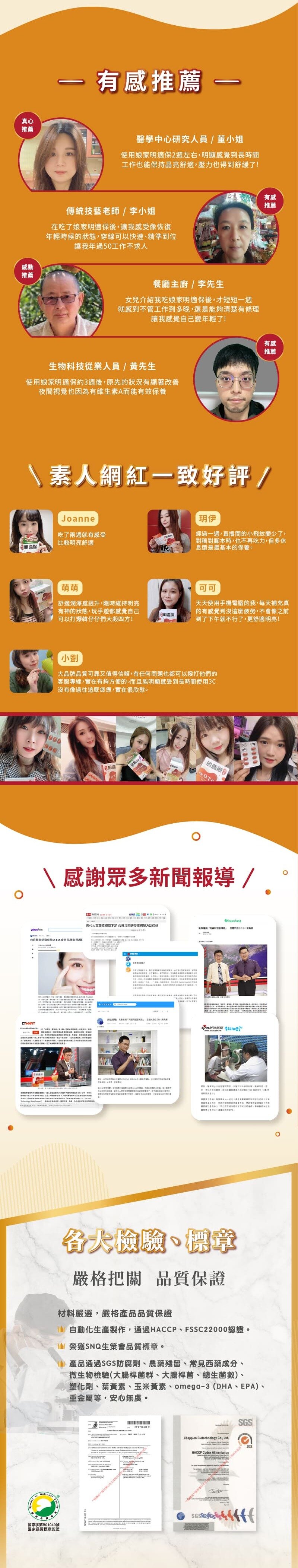 内容物:中链三酸甘油酯、凤梨酵素(麦芽糊精、凤梨酵素)、浓缩深海鱼油【浓缩鱼油(含DHA/EPA)、维生素E (抗氧化剂)】、青木瓜萃取物(糊精、乳糖、青木瓜萃取物)、无花果萃取物(无花果萃取物、麦芽糊精)、叶黄素20%【红花油、叶黄素、维生素E(抗氧化剂)】、金盏花萃取物【葵花油、金盏花萃取物(玉米黄素)】、大豆卵磷脂、脂肪酸甘油酯、枸杞萃取物(枸杞萃取物、麦芽糊精)、鸡冠萃取物(含玻尿酸)、维生素E、维生素A【蔗糖、玉米淀粉、阿拉伯胶、维生素A、水、维生素E(抗氧化剂)、磷酸三钙】